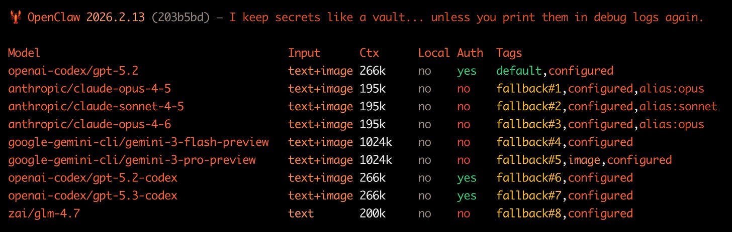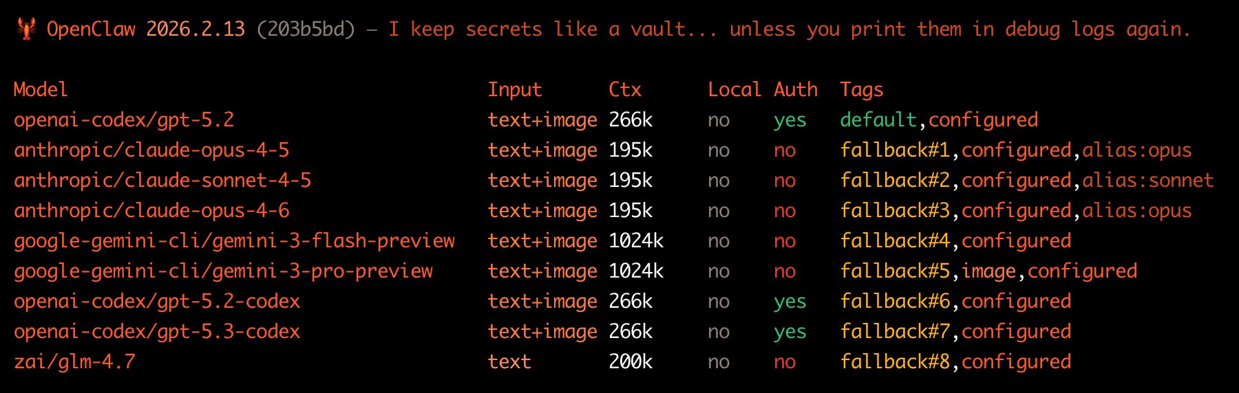 配完之后:你的小龙虾里会出现一套“模型军火库”,需要稳用 GPT,想要强表达用 Claude,要一个稳定备份用 Gemini。