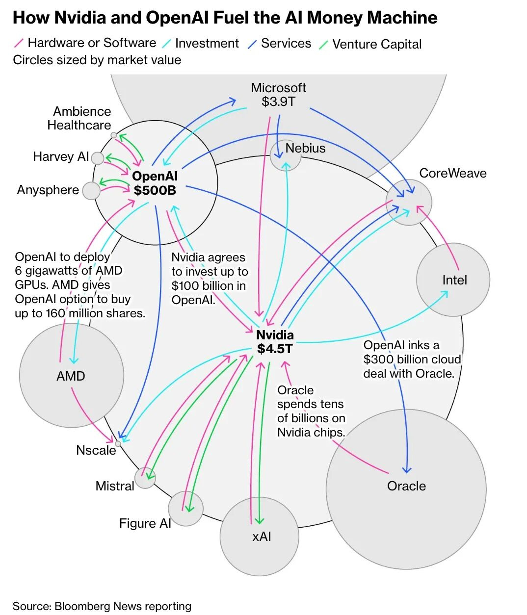 与 1 月份的“效率革命”形成鲜明对比,9 月份资本市场上演了一场豪赌。 面对 DeepSeek 等效率派的追赶,OpenAI 选择了加倍下注。英伟达、Oracle 与 OpenAI 签署了涉及数千亿美元的循环投资协议,OpenAI 更是抛出了未来几年 1.5 万亿美元的数据中心建设计划。 这种“左手倒右手”的循环投资,究竟是通往 AGI 的必经之路,还是像当年 5G 泡沫一样的资本游戏?这成了 2025 年下半年美股投资者争论最激烈的话题。