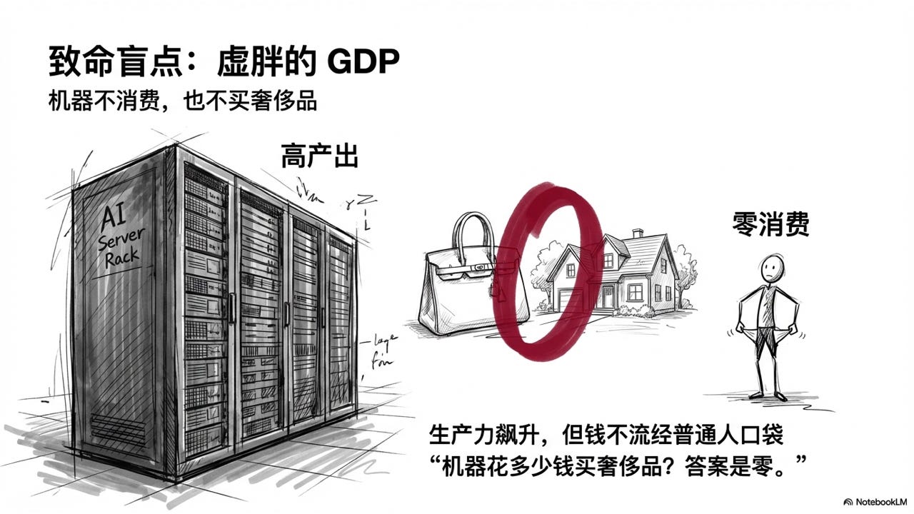 生产力在飙升,产出在增加,但这些产出不再流经人类消费者的口袋。以前一万个白领创造的价值,现在一个 AI 集群就能搞定。产出还在,甚至更多了,但创造这些产出的不再是会花钱的人,而是不需要吃饭、不需要买房、不需要消费的机器。机器花多少钱买奢侈品?答案是零。
