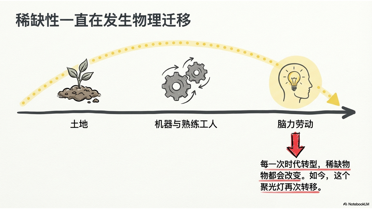 整个人类社会的经济组织,一直围绕着同一个底层逻辑运转:什么东西稀缺,什么就值钱。 而每一次时代转型,稀缺的东西都会变。