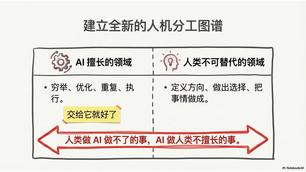 反过来,AI 擅长什么?穷举、优化、重复、执行。这些事交给它就好。人类做 AI 做不了的事,AI 做人类不擅长的事——把这个分工想清楚,你就知道自己该往哪个方向使劲了。