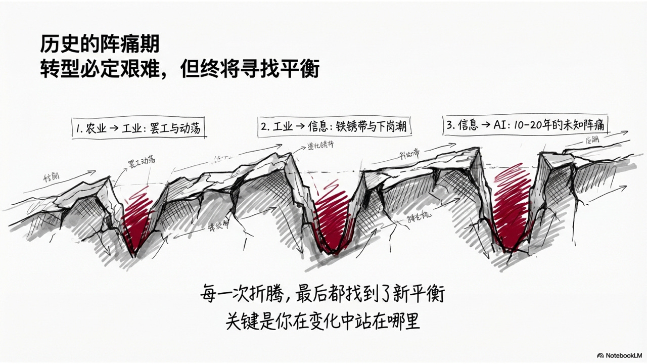 每一次大的社会转型,过程都是痛的。从农业社会到工业社会,大批农民失去土地,涌进城市,挤在条件恶劣的工厂里干活,社会折腾了几十年才建立起工会、劳动法、社会保障,找到新的平衡点。从工业社会到信息化社会,传统制造业大面积萎缩,美国有”铁锈带”,中国有九十年代的国企下岗潮——几千万人的生活被彻底改变,社会花了十几二十年才把这个坑填上。