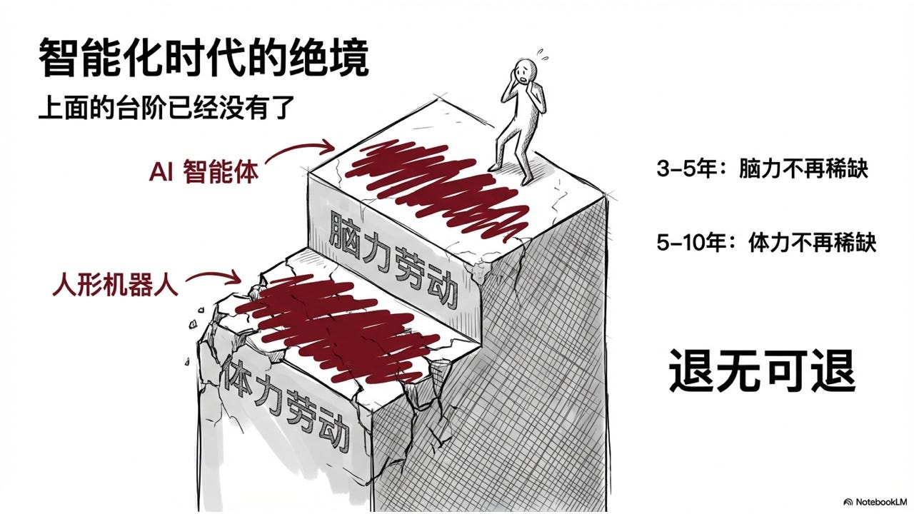 以前每一次时代转型,人都可以往”更稀缺”的方向迁移——体力劳动不值钱了,就去做脑力劳动,总有一个更高的台阶可以退。但这一次,脑力和体力同时被 AI 占领,上面那个台阶已经没有了。