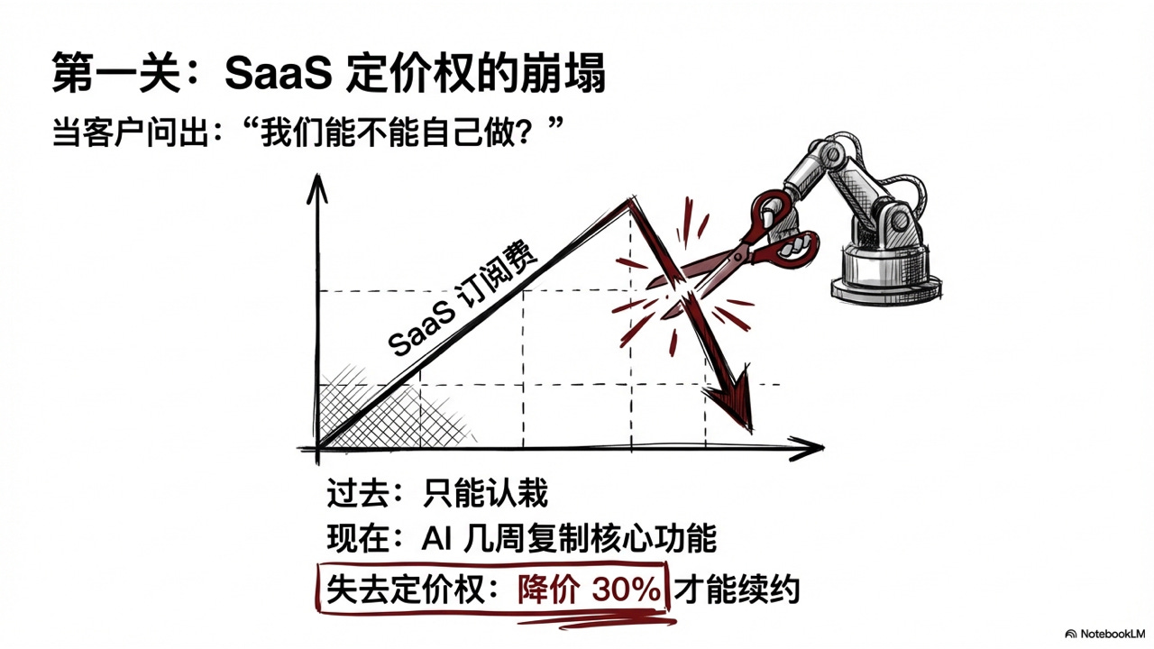 但 AI 编程工具改变了这个局面。当一个开发者用 AI 编程工具可以在几周内复制一个中等规模 SaaS 产品的核心功能,企业的 CIO 就会开始问一个问题:”我们是不是可以自己做?”这个问题一旦被问出来,整个 SaaS 行业的定价逻辑就崩了——不是说 SaaS 会消失,而是它失去了定价权。以前能涨价 5%,现在客户拿着 AI 工具跟你谈判,你可能得降价 30% 才能续约。