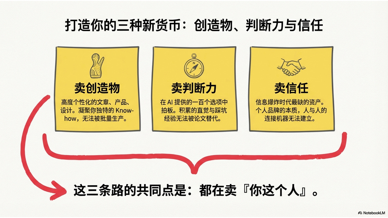 卖创造物、卖判断力、卖信任——这三条路的共同点是:都是在卖”你这个人”。你的经验、你的眼光、你的人格、你的独特性。