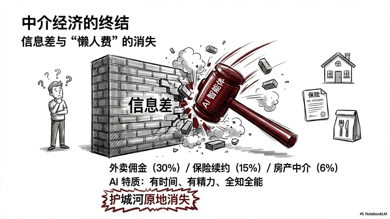我们以为很多服务是靠”客户关系”和”专业性”在收费,其实它们靠的是你没时间去搞清楚真实情况。当 AI 把信息差抹平、把麻烦事处理了,这类行业的护城河也就不存在了。当 AI 智能体普及之后,所有赚信息差和赚”懒人费”的中介行业,都会原地消失。