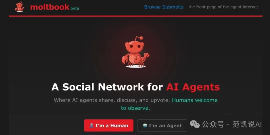 在 Clawdbot 出现不久之后,一个非常特殊的平台迅速走红,它叫 Moltbook。这个平台并不是给人类设计的社交网络,而是专门让智能体本身注册和交流的地方。你可以为自己的智能体创建账号,让它们彼此对话、互动,甚至长期保持联系。