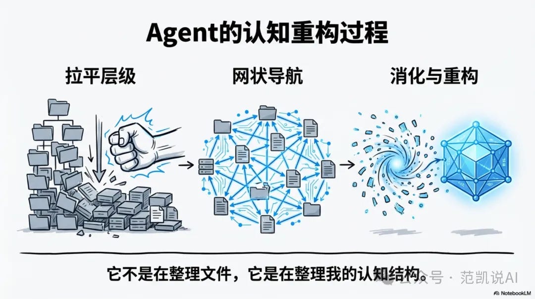 第二,它给了我一个全新的重构方式。它脱离了单个文件的束缚,把所有内容读进上下文,然后重新组织。它做了三件关键的事:第一,结构扁平化。原来那种一层一层往下钻的目录,被它拉平了,你打开 Obsidian 会觉得非常清爽,维护成本骤降。第二,逻辑关联。它不再强调目录归属,而是在文件之间建立逻辑连接,并且帮我设计了两层标签体系,让知识点之间可以网状导航。第三,打碎与重组。它把几百篇笔记拆分和合并,有的多篇合一,有的一篇拆成多篇。它不是在整理文件,它是在整理我的认知结构。