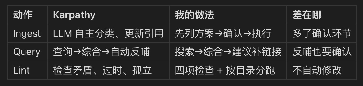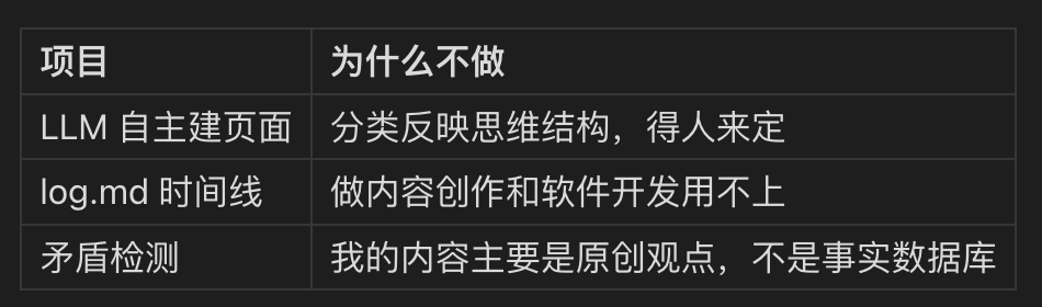 他让 LLM 全权操作 Wiki — 想建页面就建,想删就删,想改链接就改。我试过,发现 AI 对”这篇文章应该放哪”的判断经常不靠谱。