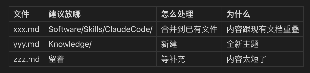 比如一篇内容创作方法论,AI 放到了 Knowledge/ 而不是 Writing/Knowledge/。一篇 Chrome DevTools 的教程,AI 新建了一个文件,其实应该合并到已有的 Claude Code 文档里。
