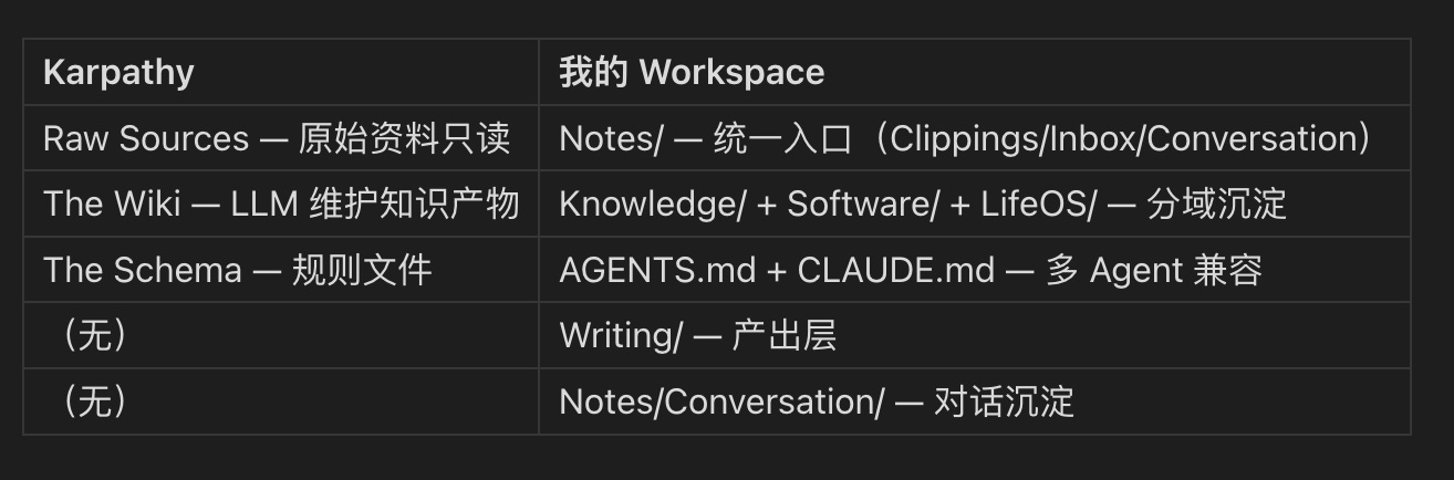 我有个设计是 Karpathy 没提到的 — Notes/Conversation,专门存跟 AI 的对话。你跟 AI 认真讨论一个问题的时候,对话过程本身就在生产知识。比如这篇文章的雏形,就是我跟 Claude 讨论 Karpathy 方案时聊出来的。把它丢掉太可惜了。