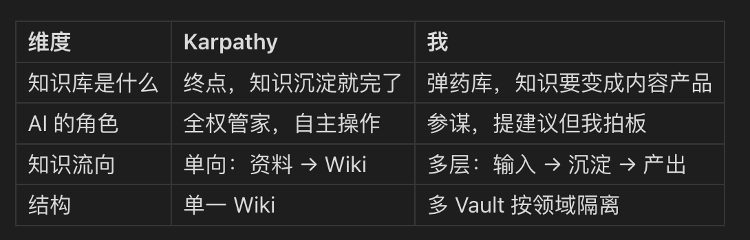 Karpathy 的 Wiki 是个终点 — 知识沉淀下来就完了。但我做内容创作,知识存着不用等于没有。所以我的系统多了两层。