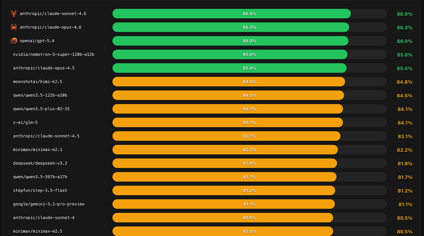 我推荐大家看 Pinchbench,这个网站专门评测各个模型跑小龙虾的表现,覆盖指令遵循、代码、写作等核心维度,数据持续更新。跟网上那些一次性评测文章不同,它的数据会随着模型版本迭代同步更新。