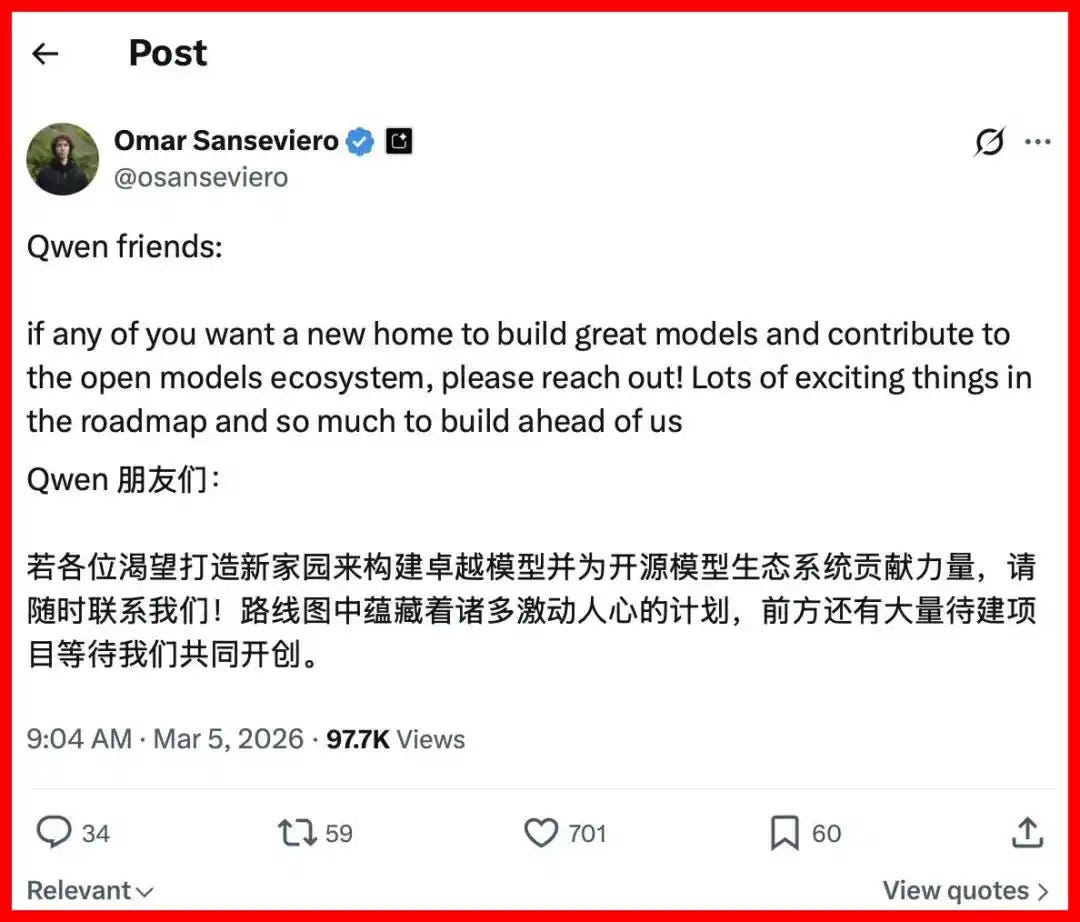 也正因为这样,这次出问题的就不是一个普通团队,而是把中国开源模型做到世界前排的核心技术团队。这种团队一旦散掉,影响一定不会小。