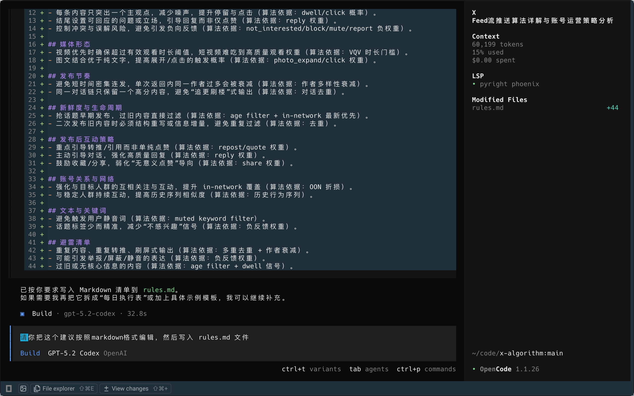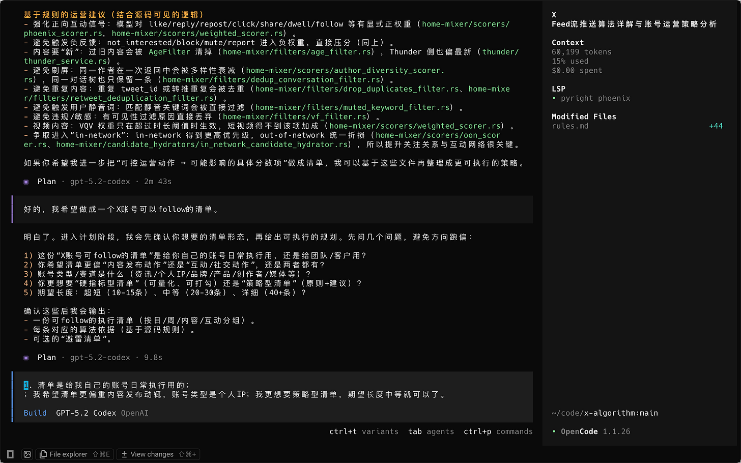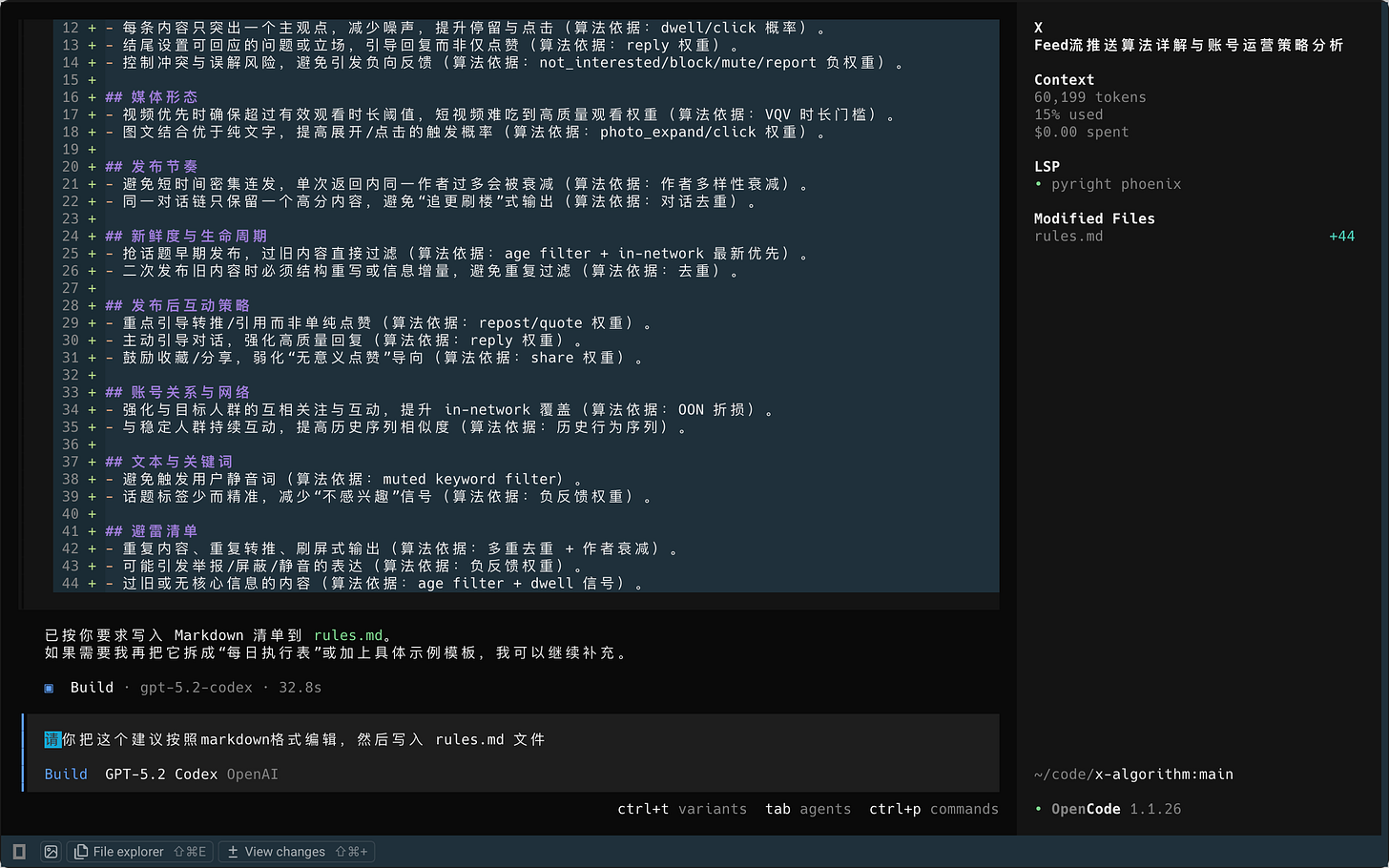 然后让 OpenCode 把算法真正使用的排序、去重、反馈规则,整理成一份面向个人 IP 的 X 运营行为指南。